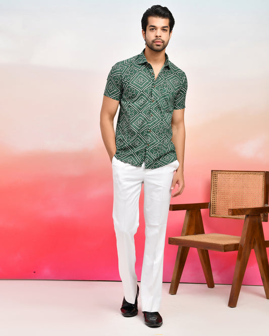Green Bandhani Print Cotton Men's Half Sleeves Shirt
